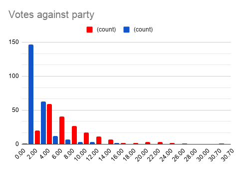 Очень интересная табличка: количество раз, когда конгрессмен голосовал(а) против своей партии.